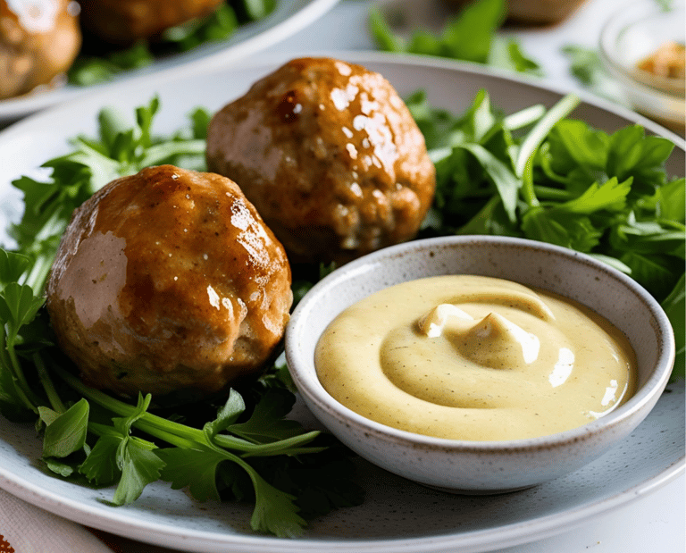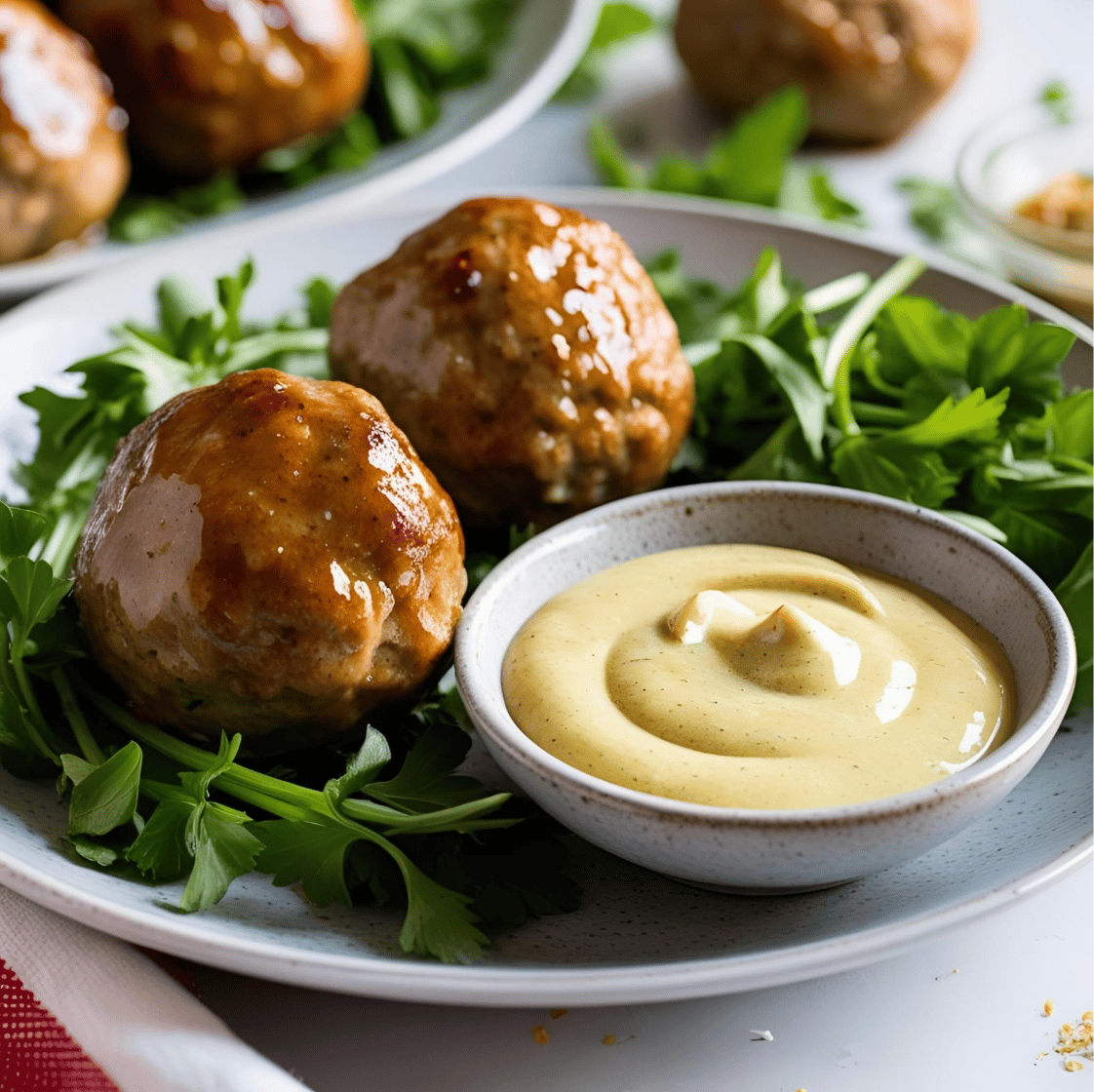 While the meatballs are cooking, whisk together the mayonnaise, Dijon mustard, ground mustard, lemon juice, and minced garlic in a small bowl.